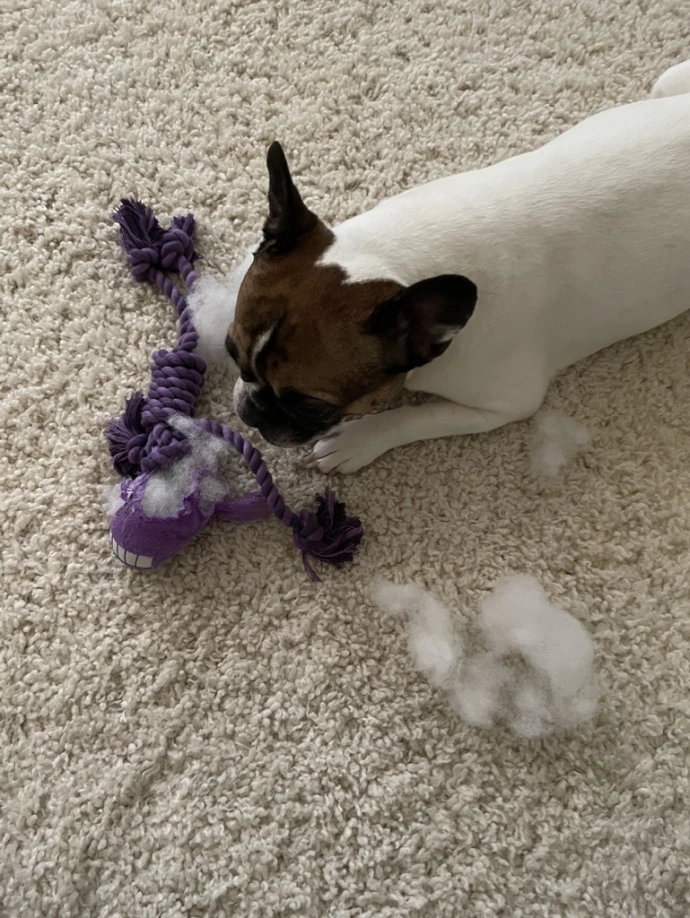 If you tell her to "let go" or "let me see it", she will after saying it a time or two. For fun, you could also tell her to "roll over". She will either roll over or spin in a circle. She also knows "go get me a toy" and "play?" which she can assume you want to play. She will very likely destroy her toys; that is totally ok, as you can see.
